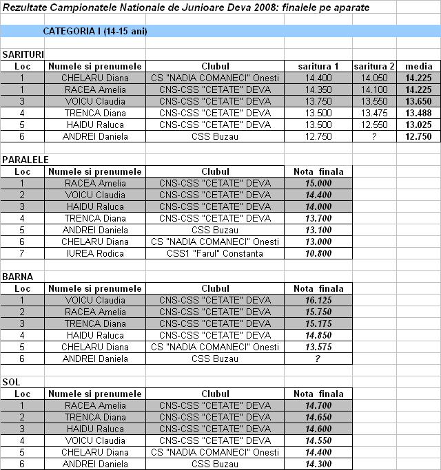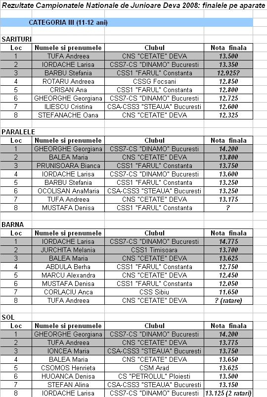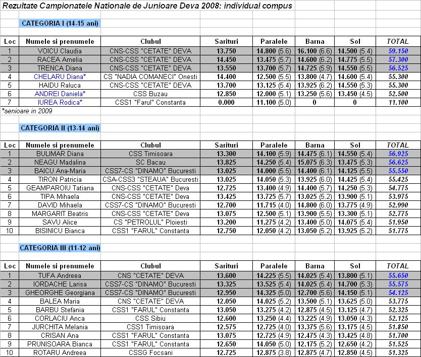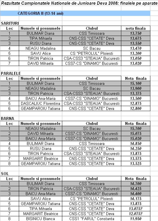 Campionatele Nationale de Junioare Deva 2008 au luat sfarsit. La categoria III au participat 32 de gimnaste, la categoria II – 16 gimnaste, iar la categoria I – 11 gimnaste.